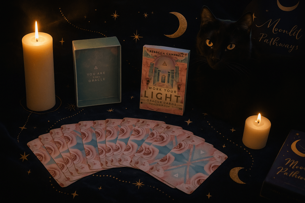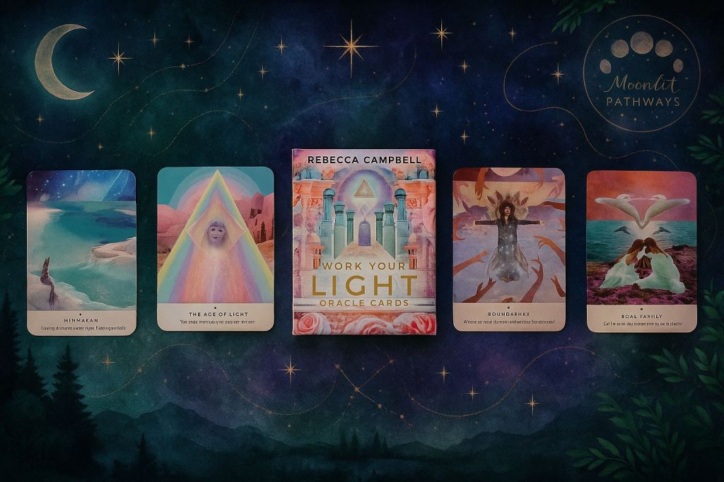 Naturally, when I got home, I reached for my Work Your Light oracle deck. Spirit was already whispering, and I needed clarity. I pulled four cards: